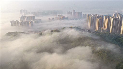 3月28日清晨,长沙城区上空出现平流雾天气,城市高楼大厦藏身云雾之中,宛如海市蜃楼般壮观和神奇。