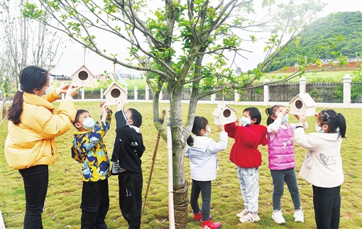 3月31日,江永县工业集中区幼儿园,老师和小朋友将自己制作的鸟巢悬挂树上,供小鸟栖息。当天,该园开展“保护生态 爱护鸟类”主题活动,小朋友在老师指导下利用废旧的纸盒、麻绳等物品制作鸟巢,给鸟儿一个温暖的家。田如瑞 摄