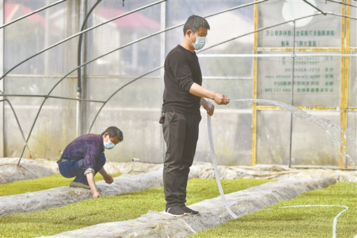 4月3日,长沙县金井镇同展农机专业合作社,工人在给秧苗浇水,该合作社早稻育秧订单已达8000余亩。该县在抓实抓细疫情防控的同时,积极备战春耕,做到“两手抓、两不误”。湖南日报全媒体记者 童迪 辜鹏博 摄影报道