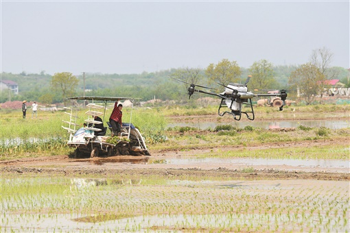 4月6日,衡阳县西渡镇梅花村,村民操控插秧机和无人机在田间进行春插作业。该县作为全国、全省重要产粮区,今年早稻种植面积47.97万亩,自4月上旬起全面开展早稻插播。钟仲华 摄