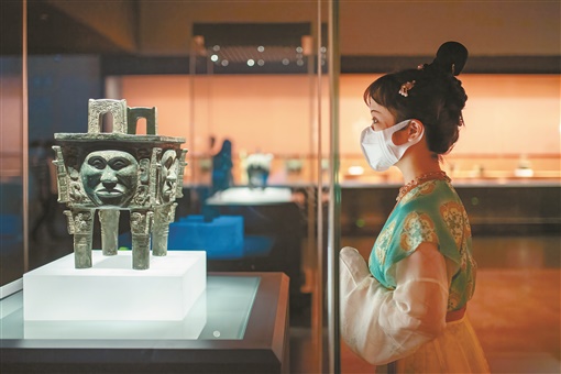 4月9日,身着古装的市民戴着口罩在湖南省博物馆参观。当天,省博物馆恢复对外开放。疫情防控期间,实行个人网络实名制预约,每天限额5000人。参观者凭预约短信、有效身份证件原件,现场扫“湖南场所码”,佩戴口罩,测量体温无异常后,方可入馆参观。