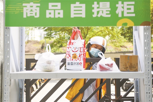 4月10日,长沙市开福区黄兴北路某小区外,骑手将外卖放到商品自提柜上,进行无接触送餐。长沙各地逐步解封后,依然执行“解封不解防”的要求,外卖、快递提倡无接触配送,共筑安全屏障。