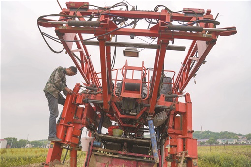 4月14日,长沙市望城区乌山街道八曲河村,绿缘家庭农场负责人任亮在保养自己发明的“黑科技”农机设备。 |