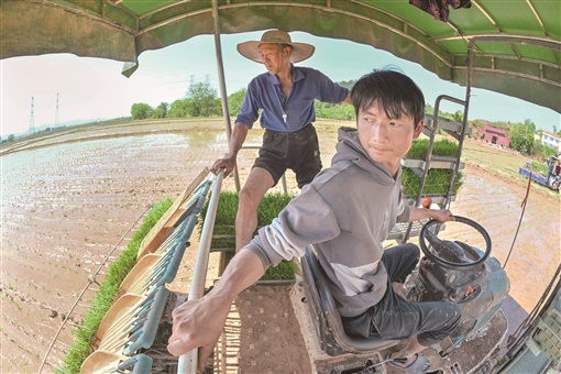 4月8日,浏阳市沙市镇沙市村,种粮大户许海明(右)操作着插秧机在机插早稻。 |