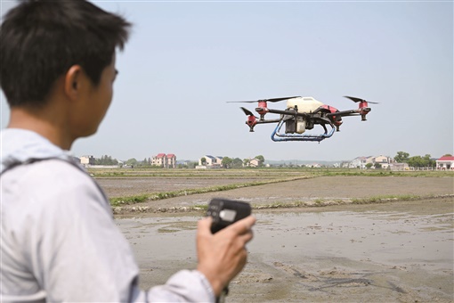 4月10日,宁乡市双江口镇,湖南极和智慧农业科技有限公司技术人员熊志平操作着农业无人机在田间喷洒作业。 |