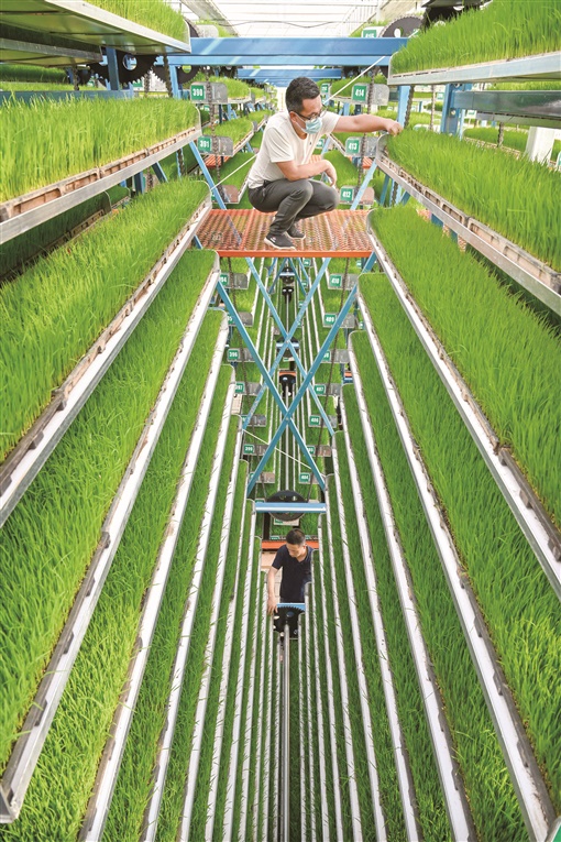 “从浸种催芽、高速播种线播种,到密室叠盘催芽、苗场培育,全是流水线生产。”智慧农业育秧工厂负责人薛永强告诉记者,“自动化、智能化、集约化、规模化、定制化生产,省工、省田、省成本。”