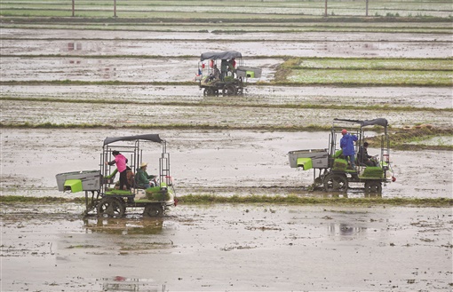 ▲4月13日,益阳市赫山区笔架山乡中塘村水稻种植基地,村民操作水稻抛秧机在田间机抛早稻。 |