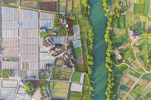 4月8日,浏阳市达浒镇金石村滩头,一排排蔬菜大棚整齐划一,与河流、村庄、农田构成一幅美丽的田园新画卷。 |