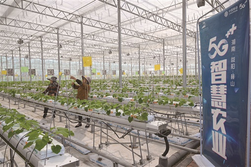 4月11日,益阳市赫山区泉交河镇“竹泉山智慧农业第一村”,村民在5G智慧农业植物工厂里劳作。 |