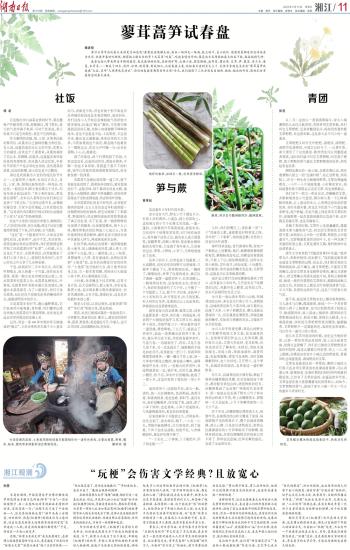 春食也给人带来鲜美丰腴的感觉。春光最好的时候,在林间旷野、山塘小溪,提篮挎镰,把荠菜、蒲公英、艾草、笋、蕨菜、马兰头、藜蒿、水芹菜……都采了回去,清炒、凉拌、做青团、剁成馅儿,几道春盘上桌,就把春天递到舌尖上了。无怪乎东坡先生会在“蓼茸蒿笋试春盘”之后,直呼“人间有味是清欢”。你们的春盘里都有些什么呢?今天,我们邀请了三位分别来自湘西、湘南、湘北的作者,请他们分享最惦念的春天滋味。