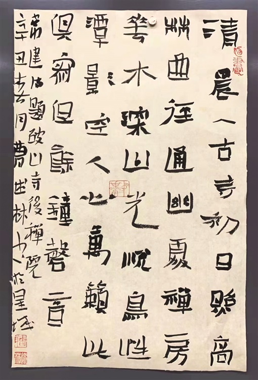曹述林从隶书起步,取法《好大王碑》,这是他学书的源头。《好大王碑》外表朴素,风蚀时磨,乍见无奇,而艺术的奇妙就在于看似形质朴拙的碑帖,一经揣摩,完全可以颠覆最初的认知,这也是《好大王碑》的内在魅力。长年游艺翰墨,神交圣贤,曹述林对《好大王碑》情有独钟,逐渐总结出一套“书法思维”,这种思维受《好大王碑》的启示,又跳出了《好大王碑》,成为他学习书法的“制胜法宝”。比方说,“逢二必变”法则,这是《好大王碑》笔画及结字的精髓,意思是,遇到相同的笔画和结体必然强调变化;变化的过程就是艺术创造的过程。再比方,“轻松表达”法则,将生硬的字体注入作者的精气神,使临摹的字体或作品神采飞扬。在曹述林看来,书法艺术的核心是表现,初学者,关注技法;再学时,注重质感;入道时,强调作为……这都是对学书者的基本要求。