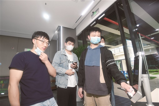 4月14日,岳麓山大学科技城中建智慧谷,湖南比邻星科技有限公司技术人员在测试人脸识别智能防疫终端。该公司研发的这个终端产品可通过人脸识别自动调取健康码、刷身份证,即便戴了口罩也能做到准确识别。