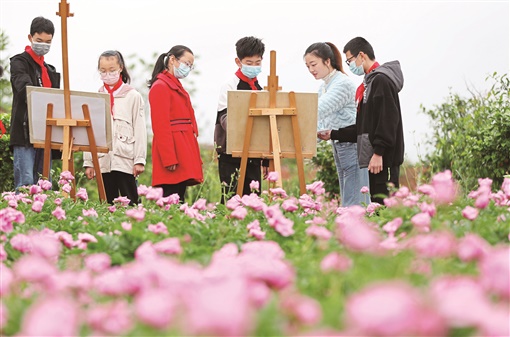 4月15日,祁东县白地市镇白地市村,美术爱好者在芍药花海里写生。眼下,该村芍药种植基地的芍药进入盛花期,吸引众多游客前来踏青赏花。