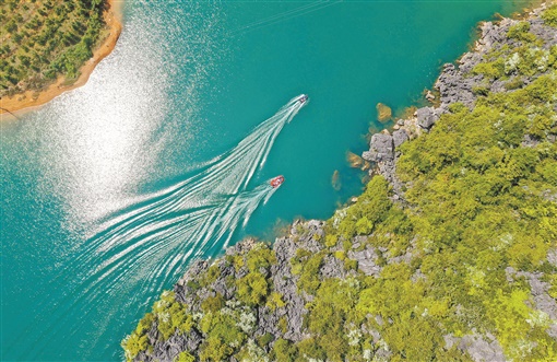 4月21日,在永州市道县寿雁镇乐海水库,护水志愿者乘坐快艇进行水上巡查作业。