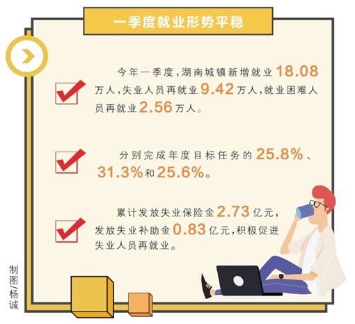今年一季度,湖南城镇新增就业18.08万人,失业人员再就业9.42万人,就业困难人员再就业2.56万人,分别完成年度目标任务的25.8%、31.3%和25.6%,累计发放失业保险金2.73亿元,发放失业补助金0.83亿元,积极促进失业人员再就业。我省克服经济下行压力和疫情等不利因素影响,强力推进就业这项最大民生工程,保持了就业形势总体稳定。