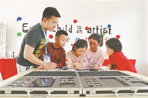 4月24日,新田县枧头镇彭梓城村小学,学生在老师指导下学习机器人编程。当天,该校开展无人机、机器人编程,人工智能等科技体验教学活动,激发学生从小爱科学、学科学、用科学的兴趣和热情。刘贵雄 刘庆 摄影报道