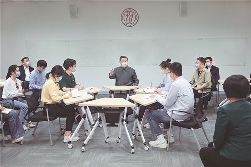 4月25日上午,中共中央总书记、国家主席、中央军委主席习近平来到中国人民大学考察调研。这是习近平在立德楼观摩思政课智慧教室现场教学并参与讨论。新华社 发