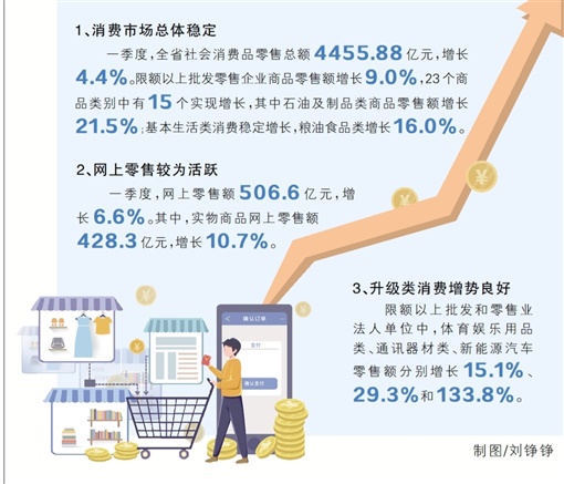 一季度,全省消费市场总体保持稳定,社会消费品零售总额4455.88亿元,同比增长4.4%。限额以上批发零售企业商品零售额增长9.0%,23个商品类别中有15个实现增长。
