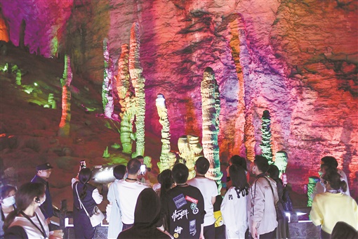 5月2日,张家界武陵源黄龙洞景区,游客在观光游玩。“五一”假期,在对湖南省内居民实行景区门票免票优惠政策的刺激下,武陵源景区成为众多游客出游打卡的首选,迎来客流高峰。 湖南日报全媒体记者 辜鹏博 通讯员 吴勇兵 摄影报道