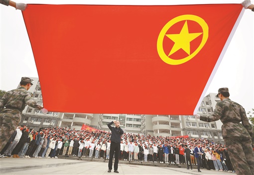 5月2日,大学生面对团旗重温入团誓言。当天,南华大学举行“青春赛道,奋力奔跑”主题团日活动,来自全校各学院的团员青年代表来到学校广场参加升国旗仪式,面对团旗重温入团誓言,同唱《中国共青团团歌》,喜迎五四青年节与中国共青团建团100周年。