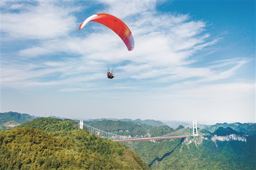 5月5日,吉首市矮寨奇观旅游区,游客乘坐滑翔伞在风光旖旎的峡谷中自由飞翔,以高空视角欣赏矮寨大桥和峡谷风光。 彭璟 摄