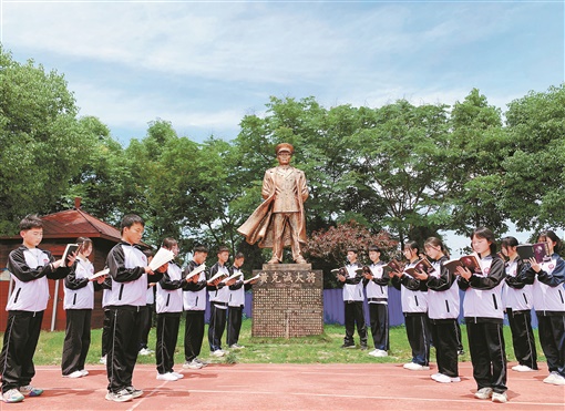 5月4日,永兴县童星学校,校团委组织团员代表在校内黄克诚大将铜像前诵读《黄克诚自述》青年篇章,引导青年学生传承红色基因,弘扬五四精神,展现青春担当。孙海明 蒋文斐 摄影报道