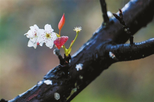 在梨林中徜徉,很多时候只能合了雨伞,时常被花朵抚摸了头发、脖颈和脸颊。梨花滴下的水珠滑落在颈脖里,凉飕飕,痒酥酥。水珠滴得越加多,便湿了衫襟,却全然不觉冷,反倒感到亲切,温馨,惬意。