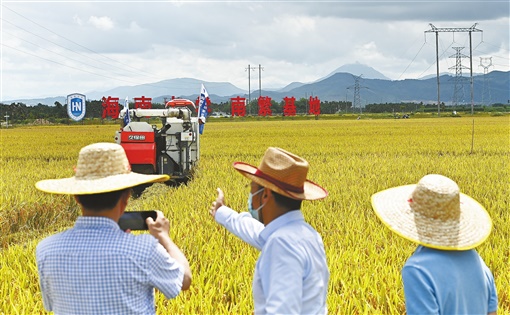 5月6日,海南杂交水稻双季亩产1500公斤攻关示范项目在三亚市崖州区(坝头)南繁公共试验基地进行测产。图为科研人员在试验基地稻田测产拍照。