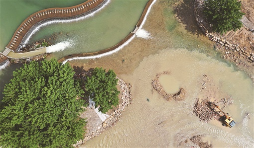 5月29日,工人操控挖机在河道上施工。近期,张家界市武陵源区打造索溪河水利景观,既满足防洪、排洪需要,又营造和谐的水环境,为市民和游客提供亲水休闲的场所。吴勇兵 摄