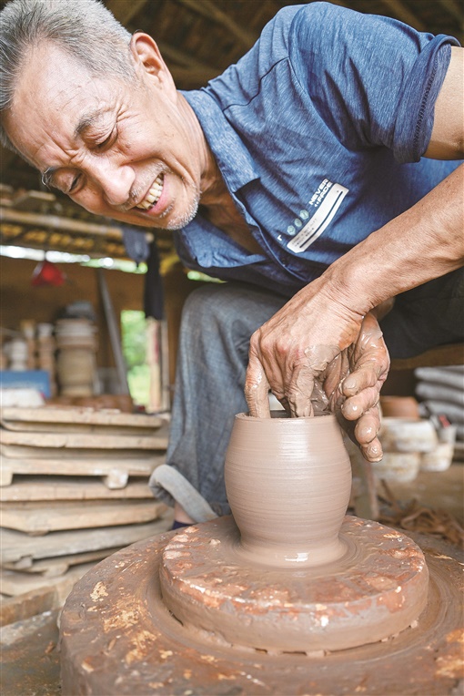 5月29日,安仁县洋际乡宜阳村李功明土陶焦钵厂,李功明在制作陶坯。土陶是安仁县的传统工艺,有近600年的历史。66岁的李功明是郴州市非物质文化遗产陶器制作技艺代表性传承人,50多年的坚守与传承,他让“泥饭碗”变成了“金饭碗”。