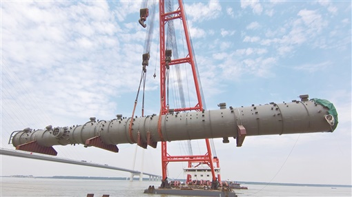 6月6日,中石化巴陵石化己内酰胺产业链搬迁与升级转型发展项目的最重大件设备——总重量达913吨的净化装置变换器吸收塔,由中石化起重运输公司顺利完成起重卸船吊装。该吸收塔上段重470吨;下段重410吨。图为470吨重的吸收塔上段卸船起吊装车现场。