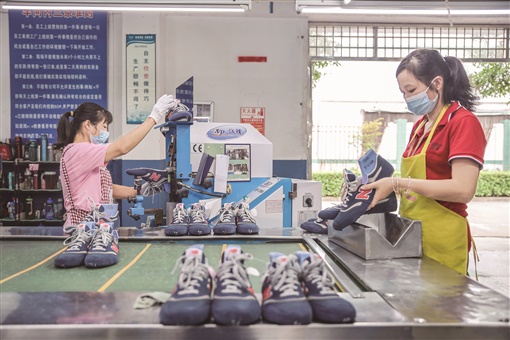 6月9日,蓝山县湘威运动用品有限公司生产车间,工人在赶制一批出口运动鞋。今年,该县加大助企纾困力度,通过发放各类补贴、落实减税降费政策、提供金融信贷支持、开展政企结对帮扶等系列稳岗就业措施,优化企业生产经营环境,增强企业发展信心,帮助企业保订单、促生产。彭华 摄