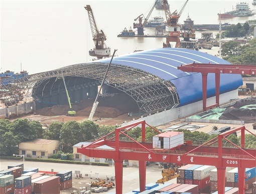 6月15日,加紧建设中的长沙新港散货堆场封闭改造工程初具规模。该工程总建筑面积10774.54平方米,跨度为67米,预计7月中旬完工。完工后可堆放6万吨货物,具备全封闭、无污染、装卸能力强等特点,将彻底解决港口扬尘、污水等环境污染问题。