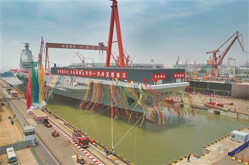 11时许,下水命名仪式开始,全场高唱中华人民共和国国歌,五星红旗冉冉升起。许其亮向接舰部队主官授予命名证书,与军地领导共同为我国第三艘航空母舰下水剪彩。随后进行掷瓶礼,香槟酒瓶碰击舰艏碎裂,舰船鸣响汽笛,船坞坞门打开,航空母舰缓缓移出船坞,停靠码头。下水命名仪式在中国人民解放军军歌声中结束。