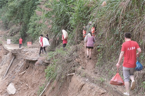 6月21日,辰溪县谭家场乡白岩冲村,志愿者为受灾村民送去爱心物资。近日,该县普降暴雨,部分乡镇受灾较重。当地不少爱心企业采购爱心物资,关爱受灾群众。