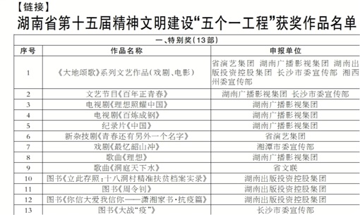湖南日报6月26日讯(全媒体记者 龙文泱)经专家评审和省委宣传部部务会议审定,近日,我省第十五届精神文明建设“五个一工程”获奖作品出炉,《大地颂歌》等73部作品获奖。