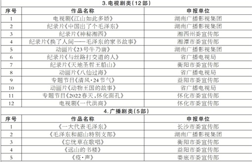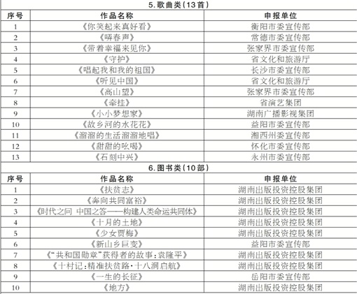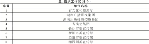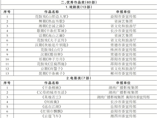 根据质量第一、优中选优的原则,《大地颂歌》系列文艺作品(戏剧、电影)、文艺节目《百年正青春》等13部作品获得特别奖;花鼓戏《山那边人家》、电影《半条棉被》、电视剧《江山如此多娇》、广播剧《一大代表毛泽东》、歌曲《你笑起来真好看》、图书《扶贫志》等60部作品获得优秀作品奖。此外,省文旅厅等8个单位获得组织工作奖。