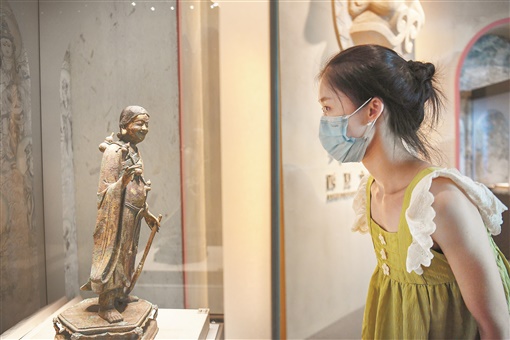 6月30日,市民在观赏鎏金拾得铜造像。当天,由长沙市文化旅游广电局主办,长沙博物馆、宁夏博物馆承办的“贺兰山下——西夏文物特展”在长沙博物馆开展。本次展览集中展示宁夏回族自治区内的西夏文物展品共146件,全面反映西夏文化、经济、建筑等方面的成就。湖南日报全媒体记者 辜鹏博 廖慧文 摄影报道