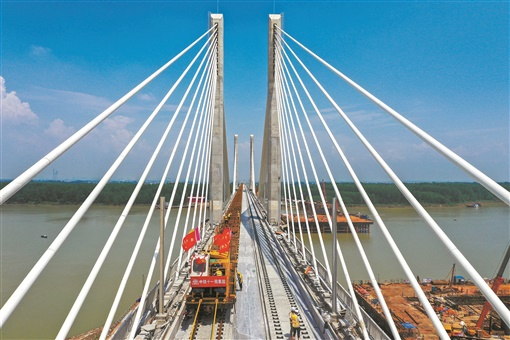 7月1日,中铁十一局的建设者在沅江特大桥主跨上进行铺轨作业。当天,常益长铁路项目铺轨施工顺利通过沅江特大桥主跨,标志着常益段铺轨进入施工快车道,为全线完成铺轨目标奠定坚实基础。