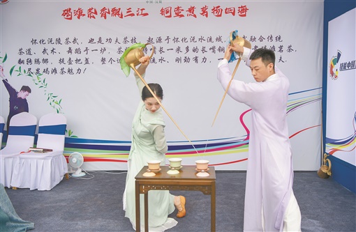 “爸爸,快看‘武术’表演!”一段沅陵碣滩茶的茶武表演引得往来众人驻足,小朋友迫不及待地拿着父亲的手机拍摄留念。只见茶艺师罗满手持嘴长一米多的长嘴铜壶,翻转腾挪,提壶把盏,整个过程行云流水、刚劲有力,一招一式皆是功夫。