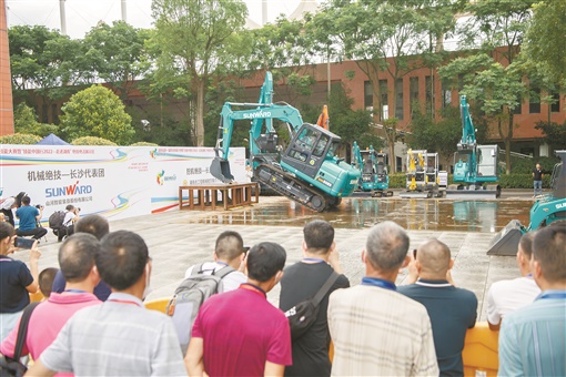 茶里有精细功夫,代表长沙出场的挖掘机也不遑多让。展演现场,来自山河智能的团队带来了工程机械展演。曾经登上《中国达人秀》《高手在民间》等节目的田威操纵挖掘机带来精彩“挖掘机独舞”表演,无尾回转、底盘伸缩、动臂偏转……笨重的挖掘机在他的手下变得灵动,尽展中国制造的魅力。