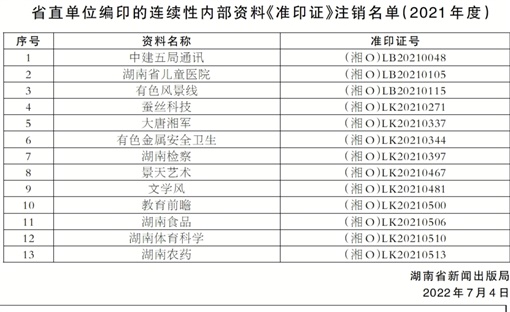 湖南省新闻出版局于近期对2021年度全省连续性内部资料《准印证》进行了重新核发,部分省直编印单位主动申请停办,部分省直编印单位逾期未办理有关手续。根据《内部资料性出版物管理办法》第二十一条规定,湖南省新闻出版局从即日起注销以下13种连续性内部资料《准印证》。