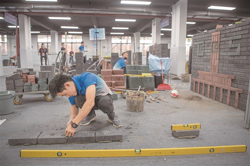 图② 7月4日,湖南工贸技师学院,参赛选手在进行砌筑项目竞赛。