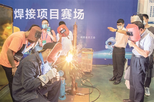 图③ 7月5日,株洲市湖南巧匠技术服务有限公司,参赛选手在进行碳钢板板横焊技能演示。本版照片均为湖南日报全媒体记者 李健 辜鹏博 摄影报道