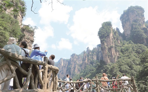 7月8日,游人在张家界市武陵源区百龙天梯观景平台游玩。暑期来临,武陵源区清新凉爽、景色秀美,当地在做好防疫措施的同时,推出一系列暑期旅游优惠政策,多端发力做旺市场,旅游复苏持续升温。吴勇兵 摄