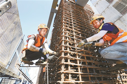 7月13日上午9时许,中建五局三公司承建的长沙金茂大厦项目,施工人员在绑扎钢筋。近期,长沙持续高温天气,项目部要求各分包单位利用早晚时段错时施工,减少高温时段工人户外施工时间。