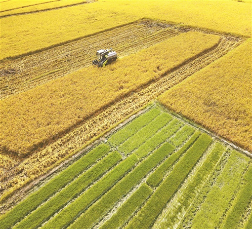 7月12日,双峰县荷叶镇清泉村,农民驾驶收割机收割早稻。时下,该县全面进入“双抢季”,农民冒着酷暑抢收早稻、抢插晚稻,广袤的田野上呈现一派丰收景象。 李建新 摄