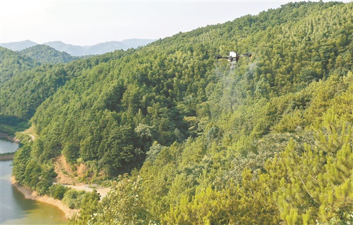 上图:7月15日,祁东县玉合街道办事处九塘冲水库,无人机在高空施药防治。近期,该县玉合山、鼎山公园等区域马尾松毛虫害较为严重,相关部门通过喷洒防治药剂,切实保护松林资源和林农的经济利益。
