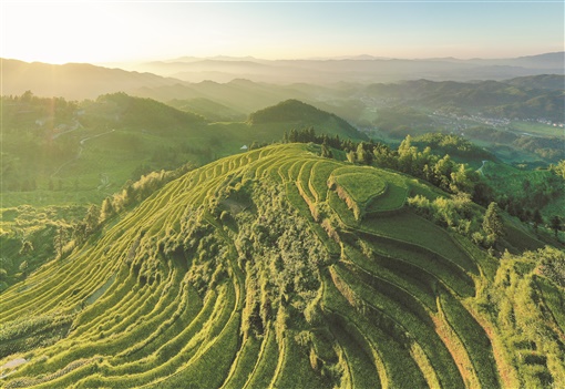 站在紫鹊界景区制高点,向远处眺望,层层叠叠的梯田沿着群山起伏绵延。这里无任何山塘、水库,也无需人工引水灌溉,梯田依靠森林植被、土壤、田埂综合形成了天然的储水保水、自流灌溉系统,在山体插一根管子就有水,被列为世界灌溉工程遗产,有2000多年的农耕历史。