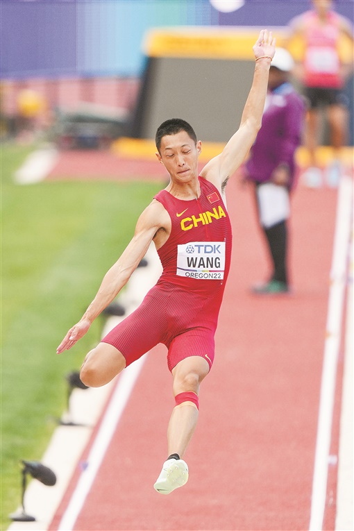 7月16日,在美国举行的2022世界田径锦标赛男子跳远决赛中,中国选手王嘉男以8米36的成绩夺得冠军,为中国赢得史上首枚世锦赛男子跳远金牌。新华社 发